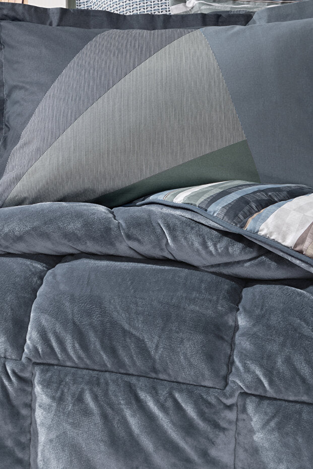 Rach Navy Blue Triola Set functions as a quilt, eliminating the need for a duvet cover or bedspread.