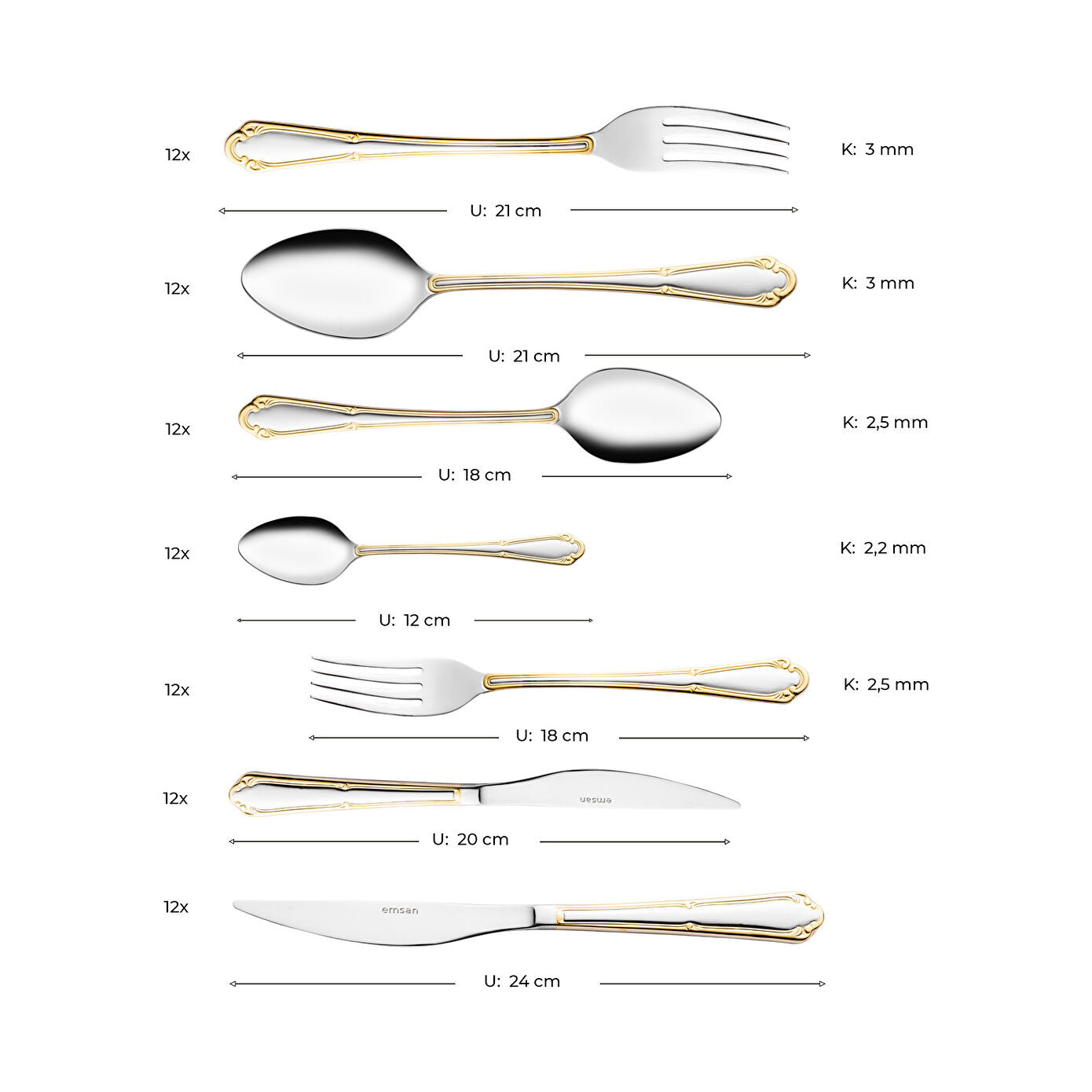 Stainless steel fork, spoon and knife set that brings the most elegant form of steel to your tables with Emsan quality.