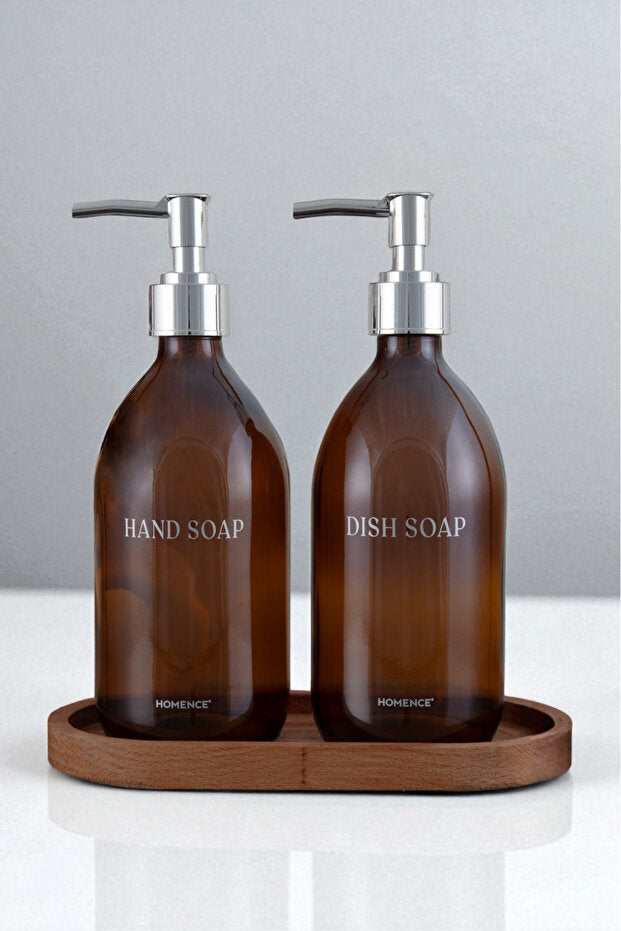 Soap Dispenser Set with Wooden Stand - Silver